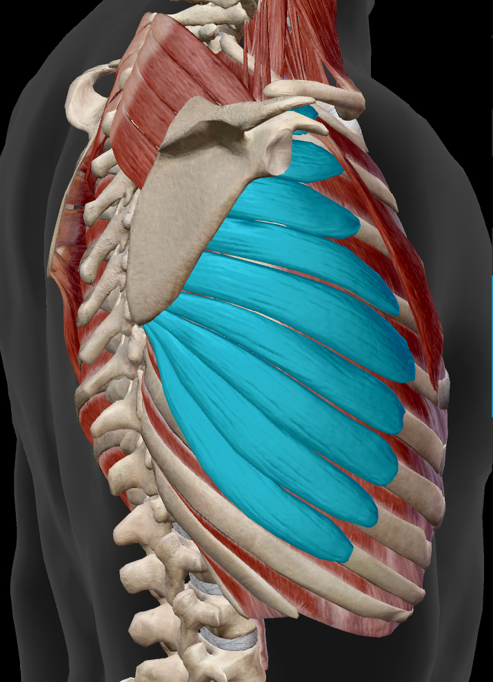 役割は肋骨を締める、肩甲骨を上に回旋させる、下に回旋させる、外側に開かせる、下に下げるという作用があります。つまり肩甲骨を動かすためには必須の筋肉なのです!