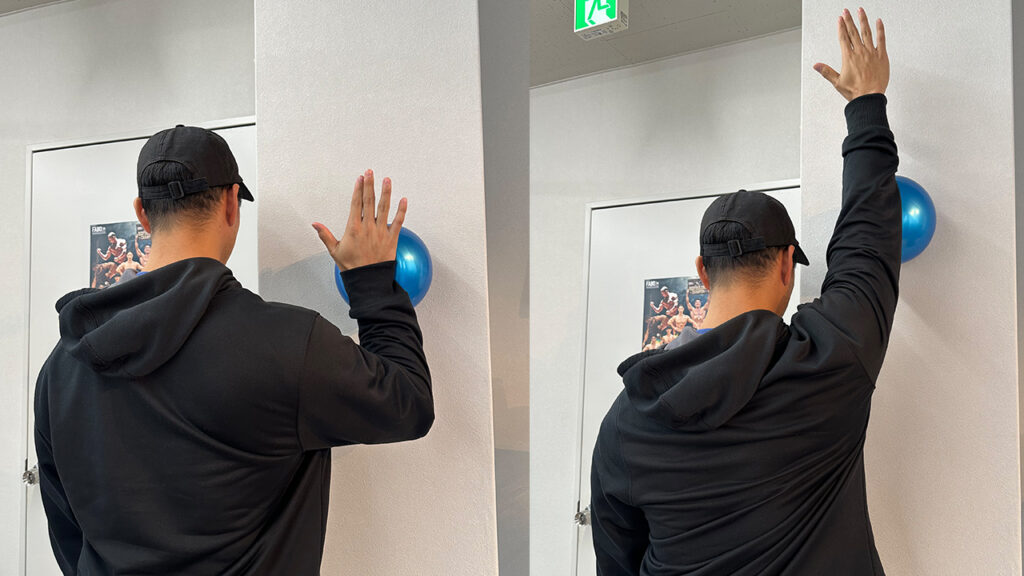 そして次のように壁と手でボールを挟むようにします。そしてこのままボールを強く腕で押しながらスライドをさせます。戻すときも同様に押しながら戻します。この動作を行うだけで前鋸筋を鍛えることができます。