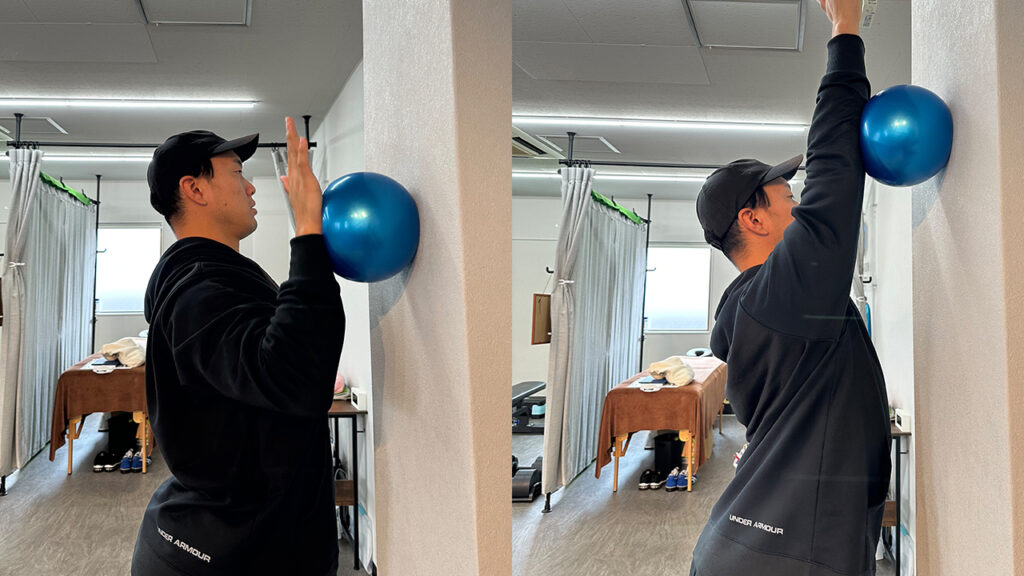 もしこのとき上げ切ることに痛みを覚える場合は少しずつ上に上げる距離を出してみてください。最初は上まであげれなくても大丈夫です!